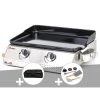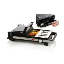 3 en 1 : Plaque de cuisson + Surface de gril avec rainures – PossibilitĂ© de l’ouvrir completement – Plaque de cuisson : de 40×25 cm a 60×25 cm – Couvercle de gril tournant 180° – Thermostat rĂ©glable – tĂ©moin lumineux – Bac de rĂ©cupĂ©ration – Puissance : 2200W – Garantie : 2 ans