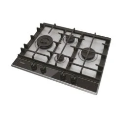 - Plan de travail gaz inox de 60 cm avec design premium « All Black » : brûleurs noirs, commandes frontales noires, grilles en fonte, surface en métal et inserts en verre noir.