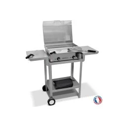 Ensemble composĂ© de 8 articles : 1 plancha + 1 couvercle + 1 chariot + 4 ustensiles + 1 housse. Informations concernant la plancha NEO E530 : appareil conçu pour 8 personnes maximum. MatĂ©riel tout inox. Dimension : L53 X P43 X H18 cm. 2 zones de chauffe indĂ©pendantes. 2 Thermostats indĂ©pendants de 50° Ă 300° . Bol de rĂ©cupĂ©ration des jus amovible. Les 3 bords de la plancha ont une hauteur de 5 cm chacun. Surface de cuisson 52 x 40 cm. Plaque de cuisson en inox alimentaire Ă©paisseur 3mm. Puissance : 2400 W. Poids : 14 kg. Plancha avec 4 pieds. Le cordon d’alimentation mesure 2 mètres. Norme IPX4. Branchement sur simple prise Ă©lectrique 230V/16A. La plancha sera livrĂ©e avec un couvercle en inox : Bien pratique pour cuisiner Ă l’Ă©touffĂ©e ou bien maintenir en tempĂ©rature. Le chariot est en acier magnĂ©lis : Cette matière ne rouille pas. Il a 2 roues fixes et 2 tablettes fixes non rabattables. Il est Ă©quipĂ© d’une Ă©tagère basse. Dimension hors tout : L 120 X P40 X H86cm. Dimension entre les 2 tablettes : 56cm. Chariot livrĂ© en pièces dĂ©tachĂ©es, notice de montage jointe. Grâce aux 4 ustensiles vous pourrez cuisiner et nettoyer votre plancha. La housse protĂ©gera l’intĂ©gralitĂ© du matĂ©riel. MatĂ©riel conçu et fabriquĂ© en France. MatĂ©riel Ă usage domestique uniquement