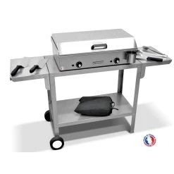 Ce pack est une association de 8 articles. Tout à été pensé afin que vous n’ayez rien à prévoir en plus. En effet, vous aurez 1 plancha + 1 couvercle + 1 chariot + 1 housse + 4 ustensiles. Informations concernant la plancha NEO E650 : Appareil conçu pour 10 personnes maximum. Matériel tout inox. Dimension : L65 X P43 X H18 cm. 2 zones de chauffe indépendantes. 2 Thermostats indépendants de 50° à 300° . Bol de récupération des jus amovible. Les 3 bords de la plancha ont une hauteur de 5 cm chacun. Surface de cuisson 64 x 40 cm. Plaque de cuisson en inox alimentaire épaisseur 3mm. Puissance : 2400 W. Poids : 17 kg. Plancha avec 4 pieds. Le cordon d’alimentation mesure 2 mètres. Norme IPX4. Branchement sur simple prise électrique 230V/16A. La plancha sera dotée d’un couvercle en inox. Informations concernant le chariot : Il est en acier magnélis. Cette matière ne rouille pas. Il a 2 roues fixes et 2 tablettes fixes non rabattables. Il est équipé d’une étagère basse. Dimension hors tout : L 140 X P40 X H86cm. Dimension entre les 2 tablettes : 79cm. Chariot livré en pièces détachées. Notice de montage jointe. Vous aurez également 4 ustensiles pour cuisiner dont 1 spatule grattoir pour le nettoyage. La housse protégera le tout des intempéries. Matériel conçu et fabriqué en France. Matériel à usage domestique uniquement