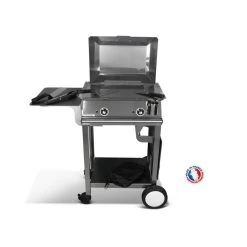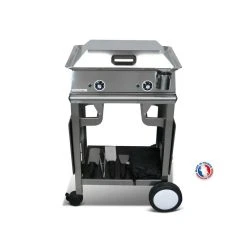 Indispensable pour vos repas en toute simplicité vous trouverez cet ensemble pour 8 personnes maximum composé de : Une plancha CLASSIC 600 – INOX, un chariot en inox, un couvercle de cuisson, 4 ustensiles et pour terminer une housse de protection. La plancha CLASSIC 600 à une puissance de 2400W, 2 zones de cuisson indépendantes, 2 thermostats réglables de 50° à 300°, une rigole sur la périphérie de la plaque de cuisson pour recueillir les graisses. Bol de récupération des graisses amovible. La plancha mesure L60cm X P45cm X H16cm. Matériel tout inox. 8 personnes. Surface de cuisson : 50 X 35 cm. Poids de la plancha : 17 Kg. Avec votre pack vous bénéficier d’un superbe chariot en inox – le chariot est tout inox. Il est constitué d’une barre à torchon en inox aussi, 4 roulettes dont 2 pivotantes et freinées. Pour un gain de place les tablettes latérales sont rabattables. Vous y trouverez 1 étagère basse pour le rangement. Celle-ci et les tablettes sont en HPL (Compact hausse densité) couleur : Marron. Design et fonctionnel il sera vous surprendre. Le Chariot est livré en pièce détachées. La Notice de montage est fournie. Voici les dimensions du chariot H 87cm – 77cm (replié) x P48cm x L127cm – 67cm (replié) -Dimensions tablettes 34.5 x 44.5cm – Largeur entre tablettes 57.5cm (600). Pour combiner le tout, vous aurez 4 ustensiles : une pince de service, une spatule courte et une spatule longue pour retourner les aliments, une spatule grattoir, un couvercle et une housse. Elle permet de protéger votre matériel des intempéries & poussières. Matériel conçu et fabriqué en France.