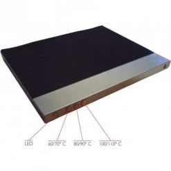 Plaque chauffante vitrocéramique – 600 x 400 – Bords droits – Sofraca Cette plaque chauffante ultra-plate en vitrocéramique permet de maintenir en température des aliments, des plats ou des bacs gastro-normes. En effet, elle dispose d’une surface de travail aux normes pâtissières 600 x 400 mm et il est possible de poser dessus des bacs gastro-normes GN 1/1. Sa conception unique, permet de découper directement vos produits sur la plaque (pizzas, quiches, tourtes, tartes, etc…) sans risque de rayer la plaque vitro. Une plaque chauffante unique sur le marché, de par son design novateur et son épaisseur de 3 cm qui vous permettra de mettre en valeur vos produits et vos plats. Car elle s’intègre facilement et parfaitement sur tout plan de travail ou de présentation. Grâce à ses bords droits, il est possible de créer un linéaire juste en posant plusieurs plaques chauffante les unes à côté des autres. C’est idéal pour les hôtels, restaurants, buffets extérieurs, cafétérias, collectivités, salons privés, salles des fêtes, etc… Surface utile : 600 x 400 mmDimensions (L x P x H) : 605 x 500 x 35 mmPuissance : 600 WAlimentation : 230 V | de la plaque chauffante ultra-plate en vitrocéramique avec bords droits Elle n’est pas seulement esthétique, elle est aussi performante : – Répartition homogène et contrôle de la température sur l’ensemble de la plaque grâce à 12 thermostats préréglés placés sous la vitre pour une vérification permanente et la garantie d’une chaleur constante sur toute la superficie de la plaque. – Système de chauffe par résistances ultrafines incorporées à un tissu de silicone en contact direct avec la plaque vitrocéramique. Cela permet d’avoir un haut pouvoir de répartition thermique. – Fusible de sécurité qui permet une alimentation basse tension interne protégée. – Position du câble d’alimentation sous la plaque