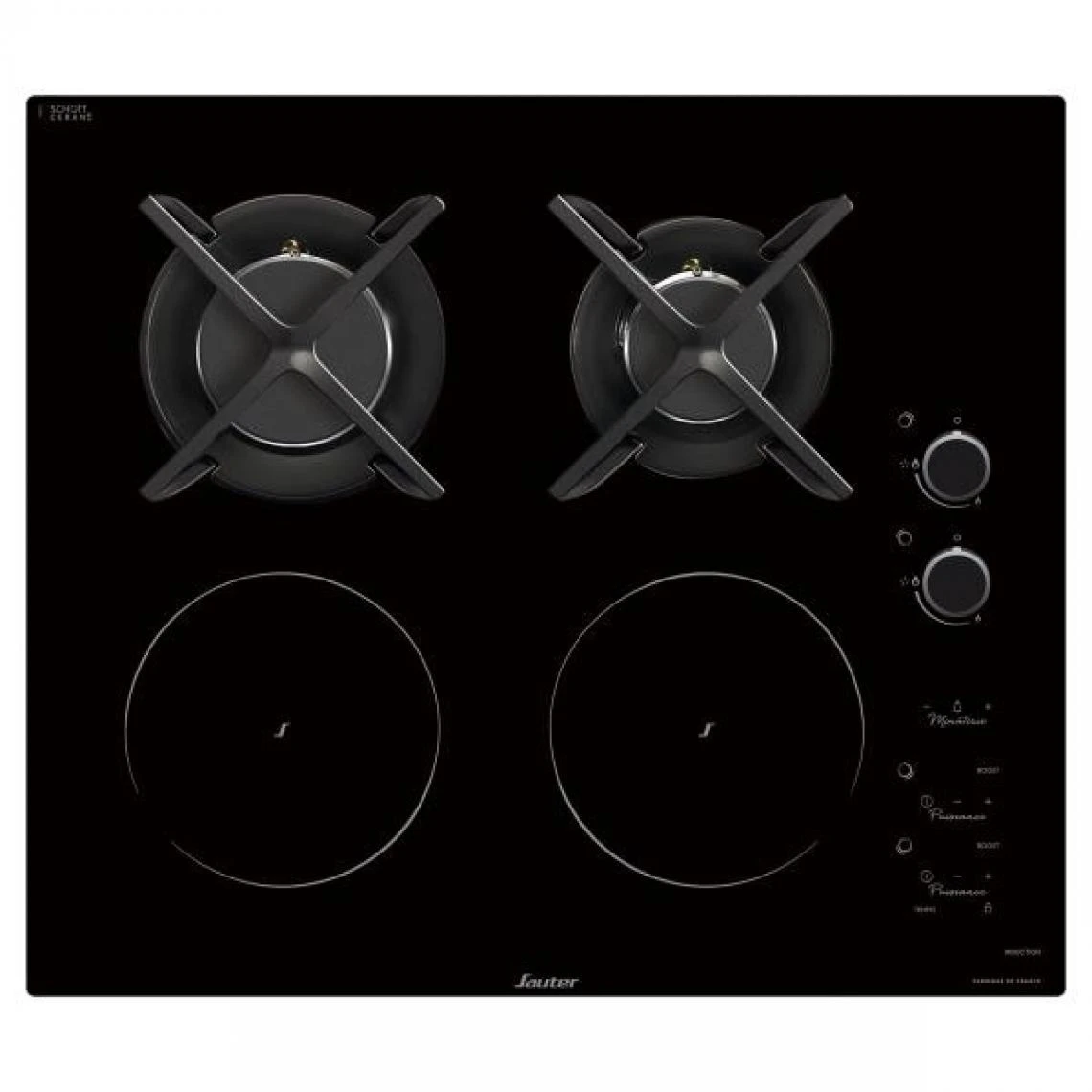 Table de cuisson mixte Gaz/Induction – Induction : 2 foyers Ø 18 cm 2,8 kW – 13 niveaux de puissance dont Booster – 1 minuterie 99 min affectable à un foyer – Fonction Tempo pour visualiser le temps écoulé depuis la dernière modification – 10 niveaux de sécurité : Anti-surchauffe, Verrouillage clavier, Auto-stop, Anti-débordement, Témoins de chaleur résiduelle, Détection de récipients, Détection de petits ustensiles, Détection faible voltage, Détection mauvaise connexion et Détection surtension – Commandes sensitives individuelles. Gaz : 2 brûleurs dont 1 rapide 3,1 kW – Allumage intégré aux manettes – Sécurité gaz par thermocouple – Grilles mono-foyer fonte.