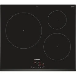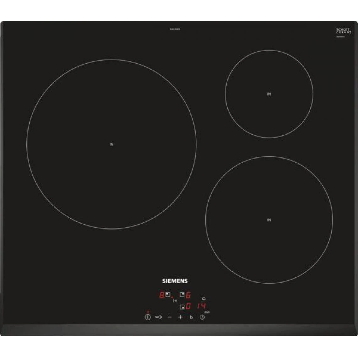 table de cuisson induction 60cm 3 feux 4600w noir – eu651bjb1e – Table de cuisson induction iQ100 Siemens EU651BJB1E bords biseautés. Table à induction avec de nouvelles fonctions innovantes, pour une grande flexibilité en toute situation.Grâce au touchControl, les zones de cuisson peuvent être activées et contrôlées d’une simple pression du doigt.L’induction, une technologie innovante, qui diminue vos temps de cuisson, vous facilite le nettoyage et vous offre plus de sécurité.Grâce à la fonction powerBoost, le temps de préchauffage est jusqu’à 50% plus rapide.Design :- Affichage digital.- Commande touchControl (+/-).Puissance :- 3 foyers induction.- Zones de cuisson : 1 x Ø 280 mm, 2.6 kW (PowerBoost 3.7 kW), 1 x Ø 145 mm, 1.4 kW (PowerBoost 2.2 kW),1 x Ø 210 mm, 2.2 kW (PowerBoost 3.7 kW).Confort/Sécurité :- Fonction quickStart : détection automatique des récipients sur la zone de cuisson.- Fonction reStart : en cas d’arrêt brutal de la table, mémorisation de la température initiale pendant 4 secondes.- 17 positions de réglage.- powerBoost sur chaque foyer.- Timer sur chaque foyer.- Témoin de chaleur résiduelle à 2 niveaux.- Sécurité enfants. – Groupe de produit : Table de cuisson.