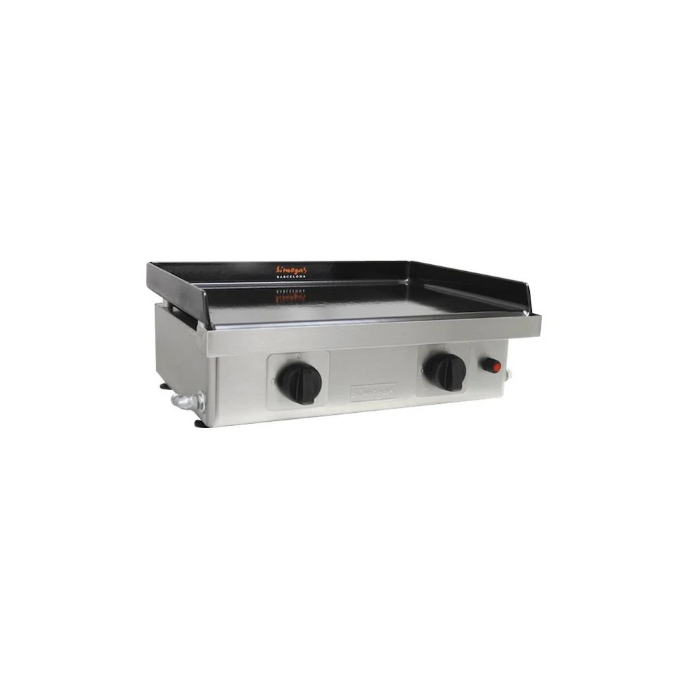 Plancha Gaz PLANCHA GAZ 75CM SIMOGAZ Chassis en acier inoxydable Plaque amovible en fonte emaillee Collecteur de graisse accroche et accessible 2 bruleurs H emailles conus pour plancha Pro, deux rampes par bruleur Bruleurs situes plus pres de la plaque, pour un meilleur rendement et une consommation reduite Design professionnel Thermocouple de securite, evite les fuites de gaz Fonctionne au gaz propane, butane et gaz de ville Allumage piezzo electronique Nettoyage rapide a l’eau froide