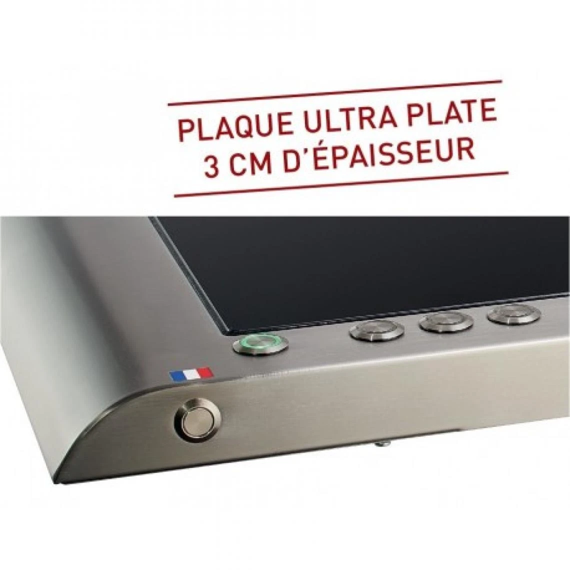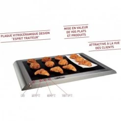 Plaque chauffante vitrocéramique – 600 x 400 – Bords arrondis – Sofraca Cette plaque chauffante ultra-plate en vitrocéramique permet de maintenir en température des aliments, des plats ou des bacs gastro-normes. En effet, elle dispose d’une surface de travail aux normes pâtissières 600 x 400 mm et il est possible de poser dessus des bacs gastro-normes GN 1/1. Sa conception unique, permet de découper directement vos produits sur la plaque (pizzas, quiches, tourtes, tartes, etc…) sans risque de rayer la plaque vitro. Une plaque chauffante unique sur le marché, de par son design novateur et son épaisseur de 3 cm qui vous permettra de mettre en valeur vos produits et vos plats. Car elle s’intègre facilement et parfaitement sur tout plan de travail ou de présentation. Surface utile : 600 x 400 mmDimensions (L x P x H) : 700 x 500 x 35 mmPuissance : 600 WAlimentation : 230 V | de la plaque chauffante ultra-plate en vitrocéramique avec bords arrondis Elle n’est pas seulement esthétique, elle est aussi performante : – Répartition homogène et contrôle de la température sur l’ensemble de la plaque grâce à 12 thermostats préréglés placés sous la vitre pour une vérification permanente et la garantie d’une chaleur constante sur toute la superficie de la plaque. – Système de chauffe par résistances ultrafines incorporées à un tissu de silicone en contact direct avec la plaque vitrocéramique. Cela permet d’avoir un haut pouvoir de répartition thermique. – Fusible de sécurité qui permet une alimentation basse tension interne protégée. – Position du câble d’alimentation sous la plaque chauffante ultra-plate pour pouvoir la positionner dans le sens souhaité par le client. Une construction tout inox brossée “haut qualité”, un panneau de contrôle simple et esthétique grâce à 4 boutons tactiles : 1 bouton pour la mise sous tension